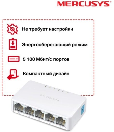 Коммутатор Mercusys MS105 белый, неуправляемый, 5 port