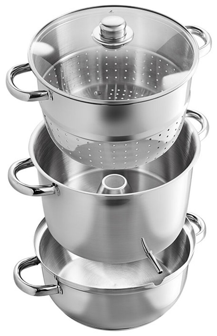 Лучшие цены. Высококачественная соковарка Kelli KL-4107 ECO (Кели) имеет объем 8 литров, изготовлена из пищевой нержавеющей стали 18/10 и является отличным инструментом для получения вкусного, а главное полезного сока из различных фруктов и ягод. Соковарка состоит из 3-х кастрюль и крышки с паровыпуском. Рассмотрим, из чего же состоит соковарка? Все просто: это нижняя кастрюля, куда наливается вода, дуршлаг, куда помещается сырье, сокосборник с силиконовой трубкой со специальным металлическим зажимом и стеклянная крышка. Магазины в вашем городе.