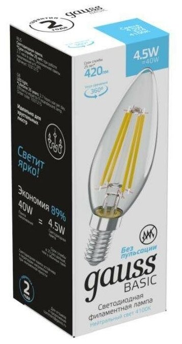 Лучшие цены. Характеристики Тип: филаментная Цоколь: E14 Цветопередача, Ra: 80 Диаметр, мм: 35 Требует пуско-регулирующей аппаратуры: нет Длина, мм: 98 Вид: CL/прозрачная Тип колбы: C Цветовая температура, К: 4100 Световой поток, Лм: 420 Срок службы, ч: 25000 Мощность (Вт): 4,5 Напряжение, В: 220 Угол светового пучка, град: 360 Эквивалент лампы накаливания, Вт: 40 Цветность: естественный белый (3300 - 5000 К). Магазины в вашем городе.