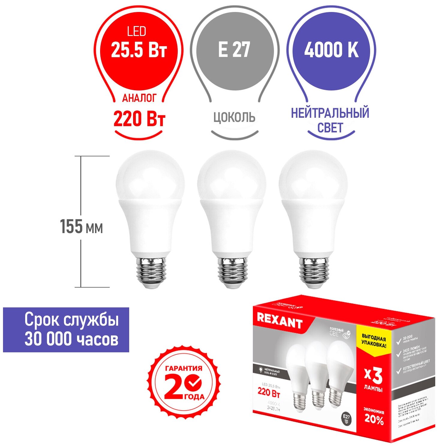 Светодиодная лампа REXANT Груша E27, 25.5 Вт, A60, 2423 Лм (=220 Вт), 4000 K (нейтральный свет), упаковка 3 шт.