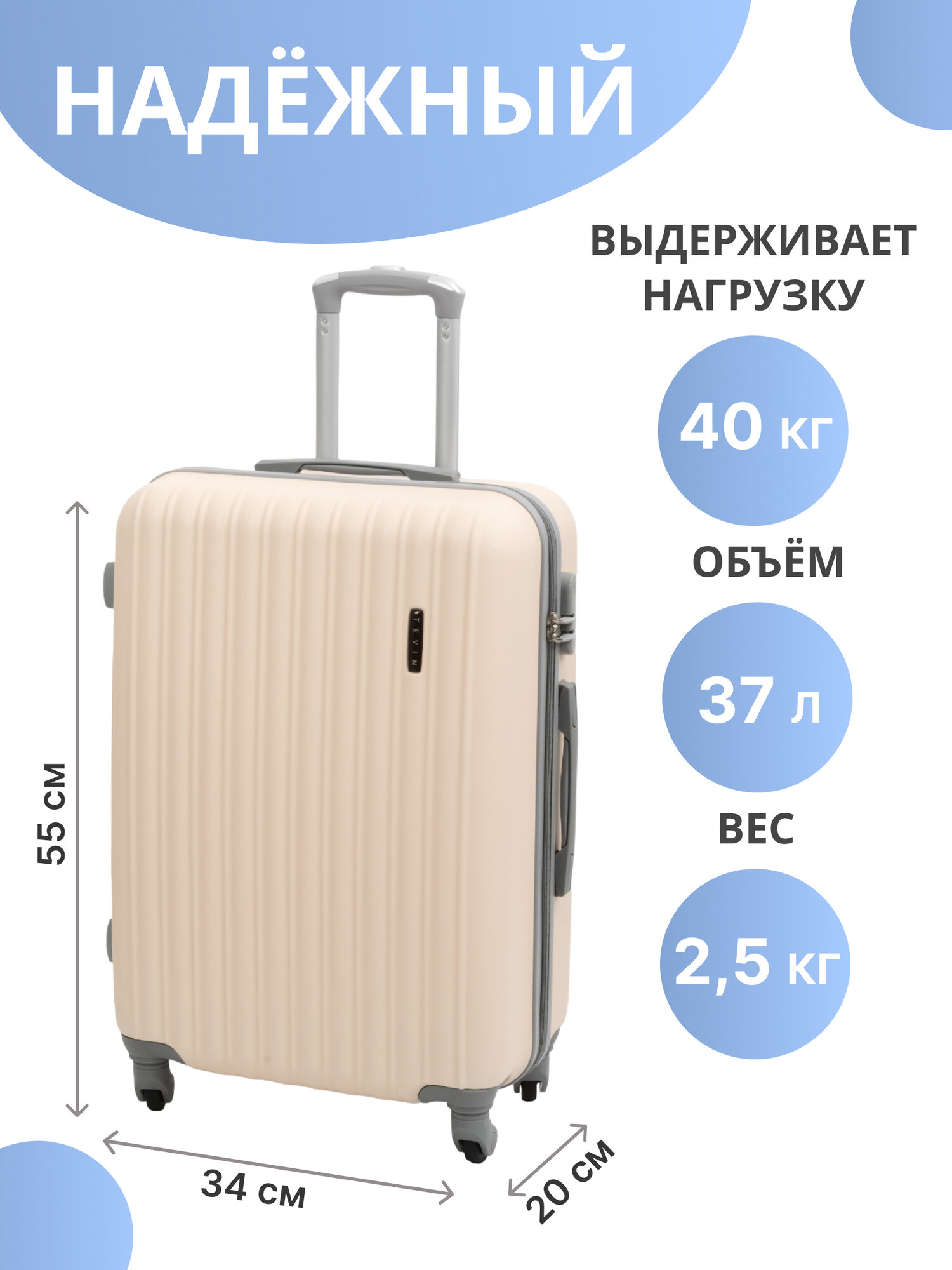 Чемоданы Чемодан на колесах дорожный ручная кладь в самолет s TEVIN размер С маленький 55 см ручной 37 л cabin 21" легкий 2.5 кг прочный abs пластик бежевый