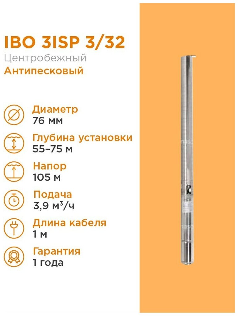 Лучшие цены. Скважинный насос IBO 3ISP 3/32 — новинка от компании IBO в мире узких 3" погружных насосов серии ISP, в производстве которых используется исключительно нержавеющая сталь. Появление новой модели скважинного насоса в 3 дюйма, является результатом опыта производства насосов серии 4ISP и 6ISP, доступных на протяжении многих лет на рынке насосного оборудования, пригодных для монтажа в колодцах 125 мм и более. Серия насосов серии 3ISP предназначены для скважин 110 мм и 90 мм. Магазины в вашем городе.