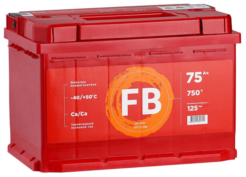 Аккумулятор Fb 75 А/Ч Прямая L+ 277x175x190 En750 А FB арт. 6CT75VL