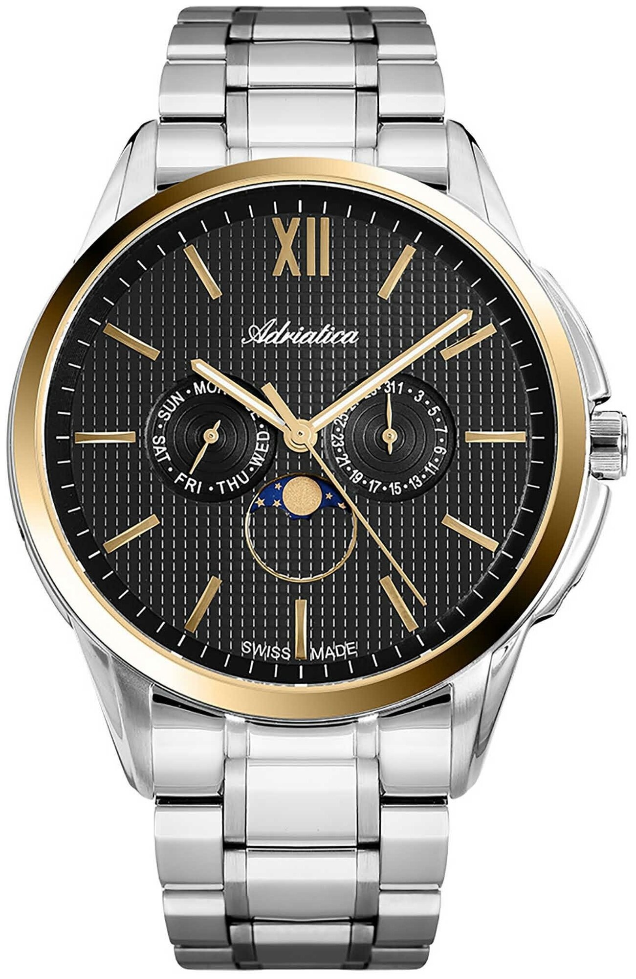Лучшие цены. Стильные часы с классическими чертами и дополнительными функциями понравятся настоящим мужчинам. Moonphase for him. Индикатор фазы Луны. День недели и число отображаются на отдельных циферблатах. Заводная головка с защитой. Браслет с раскладывающейся застежкой. Производитель оставляет за собой право вносить изменения во внешний вид часов. Магазины в вашем городе.