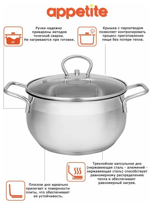 Лучшие цены. Посуда ТМ Appetite из нержавеющей стали – это больше, чем посуда. Тщательно подобранные детали, соединенные в одну систему, где каждый элемент направлен на то, чтобы процесс приготовления блюд стал легче, а продукты не утратили своих питательных свойств. Кухонная посуда из нержавеющей стали обладает прекрасными качествами для приготовления великолепных блюд. Чтобы посуда служила долго, рекомендуется следовать простым правилам по уходу. Для каждого изделия прилагается подробная инструкция. Магазины в вашем городе.