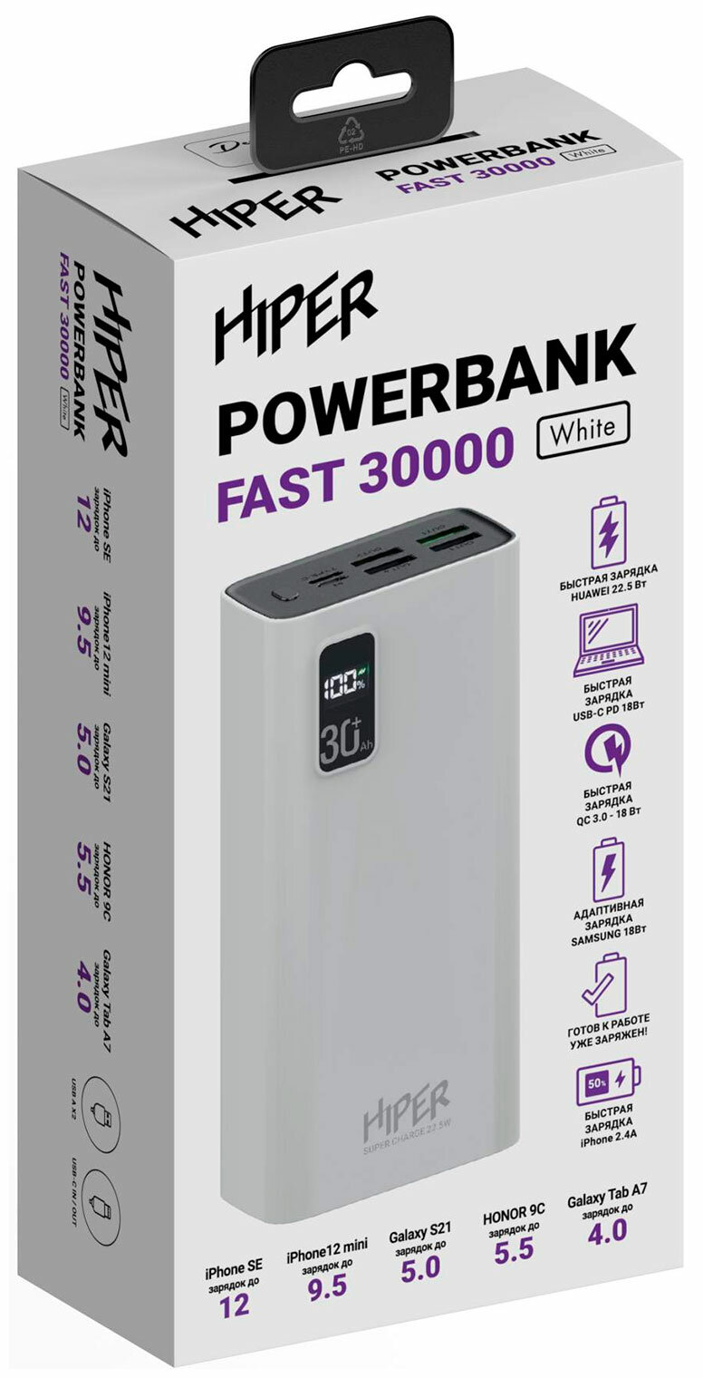 Лучшие цены. Стильный и мощный пауэрбанк HIPER FAST 30000 White станет вашим незаменимым спутником в поездке на природу или в длительном путешествии. В дамской сумочке он вряд ли поместится, но его без проблем можно положить в рюкзак и пронести на борт самолета в ручной клади. Литий полимерная батарея обладает огромной емкостью в 30000 мАч. Это поможет вам забыть о розетках во время поездок на природу или в поход и не остаться без связи в самый неподходящий момент. Магазины в вашем городе.