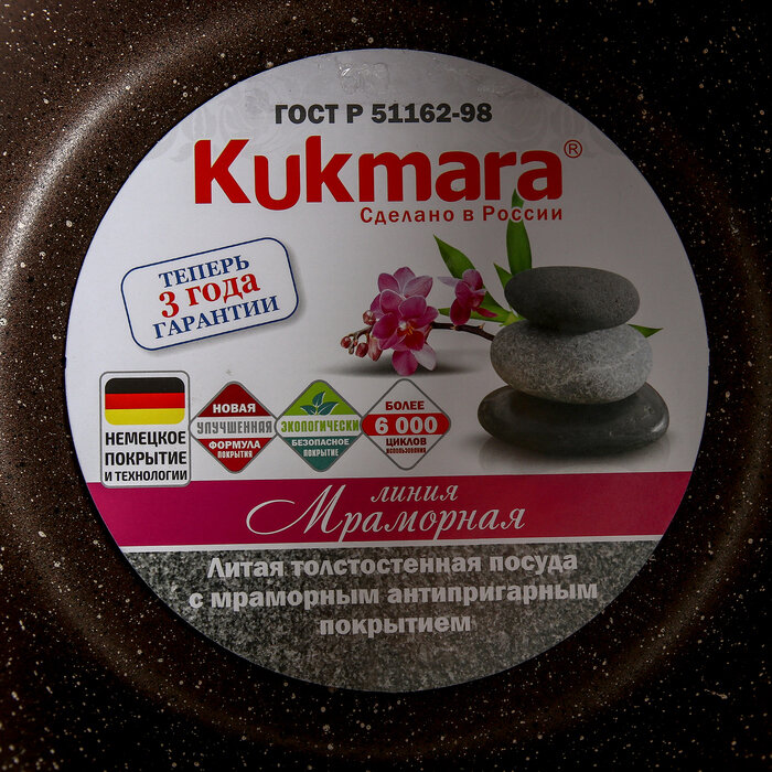 Лучшие цены. Кастрюля, 4 л, со стеклянной крышкой, антипригарное покрытие, кофейный мрамор. Кастрюля Kukmara сделана из литого алюминия. Имеет инновационное антипригарное мраморное покрытие на водной основе, которое изготовлено по немецкой технологии (Weilburger Coatings GmbH) и усилено сверхтвёрдыми частицами минералов. Особенности Значительная толщина стенок и дна исключает деформацию корпуса кастрюли, гарантирует её долговечность, обеспечивает необходимую прочность. Магазины в вашем городе.