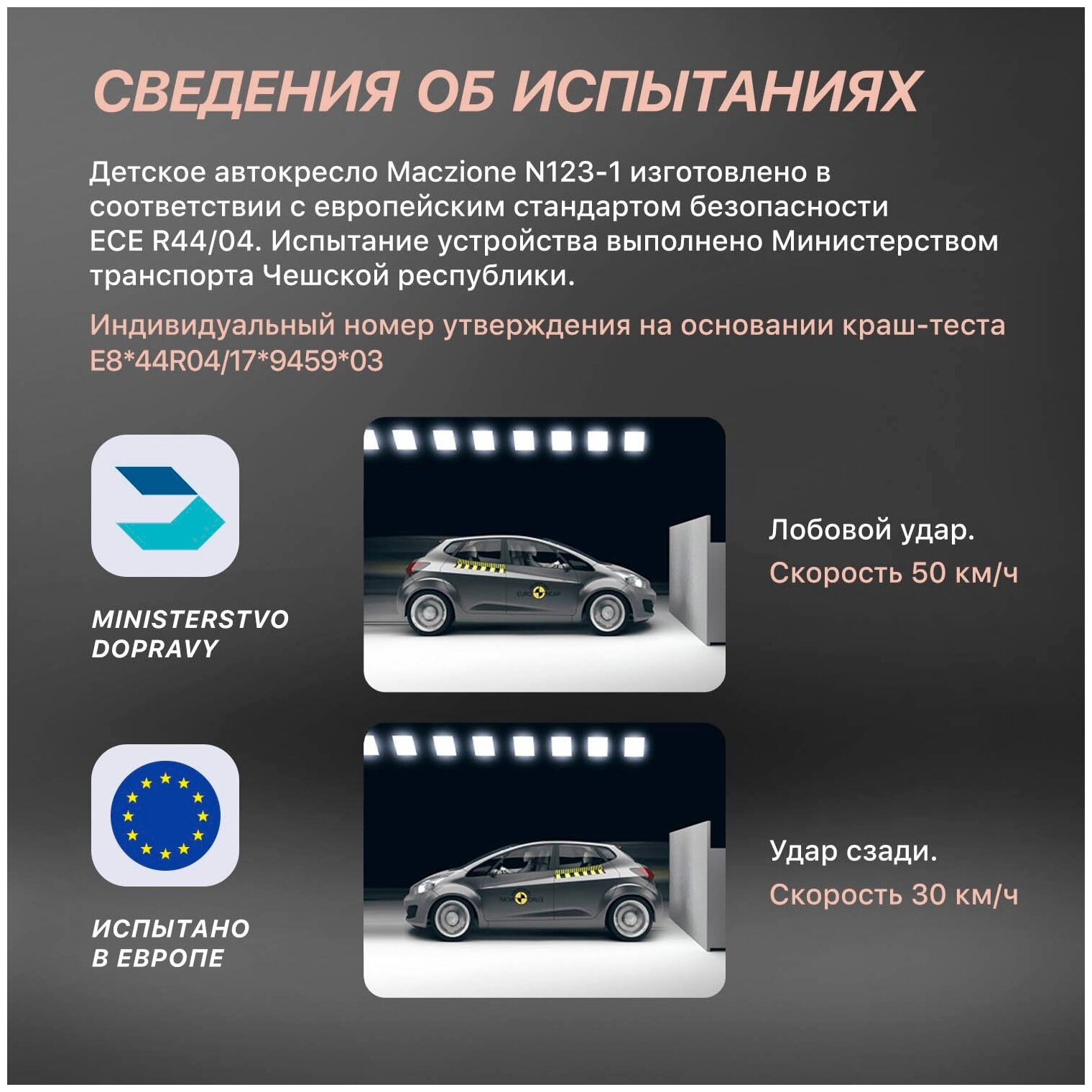 Лучшие цены. Детское автокресло Maczione N123-1 изготовлено в соответствии с европейским стандартом безопасности ECE R44/04. Испытание модели с обязательным краш-тестом выполнено Министерством транспорта Чешской республики. Данное автокресло рассчитано на детей от 9 месяцев до 12 лет (весом от 9 до 36 кг). Это детское удерживающее устройство универсального типа (для 1, 2 и 3 возрастных групп) с трансформацией в бустер. Прочный каркас обеспечивает высокий уровень защиты и длительный срок службы автокресла. Магазины в вашем городе.