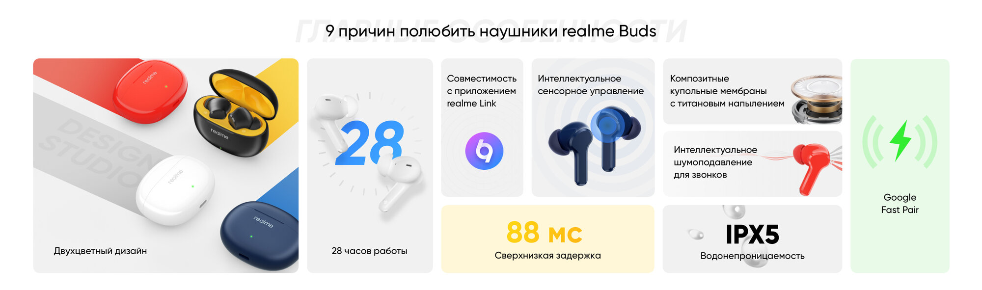 Беспроводные наушники realme Buds T100 синий, ANC, шумоподавление 2 090 ₽ Подробнее