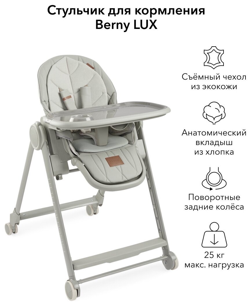 Лучшие цены. BERNY LUX — это продолжение линейки идеальных стульчиков для кормления серии BERNY. Практичный, удобный, стильный и развивающий -он регулируется по высоте сидения, подножки, ступенек и наклону спинки. Малышам будет комфортно в положении «шезлонг», а дети постарше сами заберутся в стульчик с помощью ступеньки. Цельнолитая металлическая рама без спаек и острых углов безопасна и выдерживает повышенную нагрузку до 25 кг. Магазины в вашем городе.