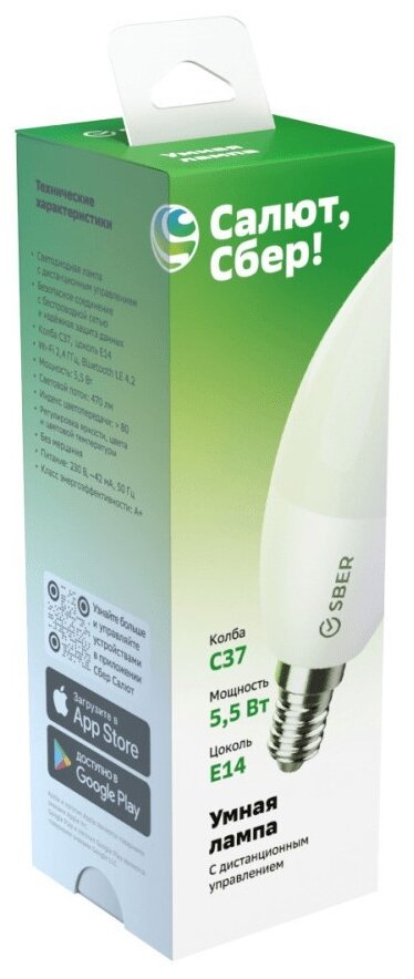 Лучшие цены. Sber C37/E14 SBDV-00020 представляет собой умную лампу, мощность которой составляет 5.5 Вт. Она может управляться при помощи смартфона на iOS или Android, на котором установлено специальное приложение «Сбер Салют», а также поддерживает работу с голосовым помощником. Для синхронизации лампы используется беспроводной интерфейс Wi-Fi. Модель можно объединить с системой «Умного дома». Магазины в вашем городе.
