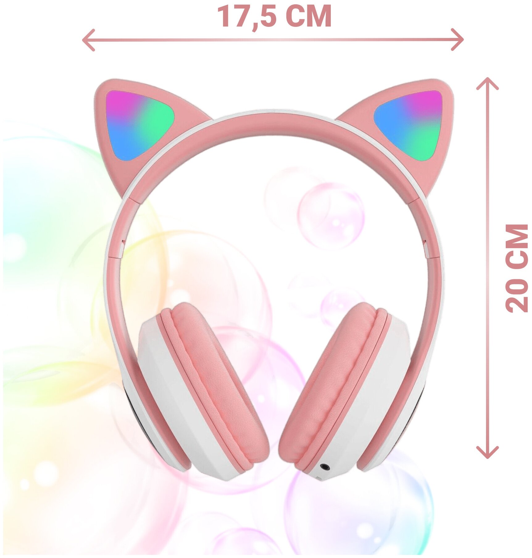 Лучшие цены. Универсальные беспроводные детские наушники с цветными кошачьими ушками Cat имеют яркий дизайн и LED-подсветка в "кошачьих ушах" привлечет взгляд абсолютно каждого! Кошачьи ушки ярко светятся красивым цветом! Помимо запоминающегося дизайна наушники удобные в ношении - они универсальны по размеру, а оголовье и амбушюры сделаны из мягкого материала. Беспроводные наушники оснащены технологией контроля громкости, которая гарантирует безопасное прослушивание для детей: уровень громкости не будет. Магазины в вашем городе.