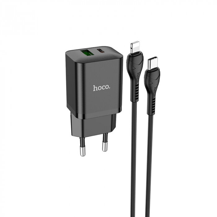 Зарядки для гаджетов Зарядное устройство Hoco N28 Founder (USB-C PD20W + USB QC3.0) + Кабель Type-C to Lightning 1 m, Черный
