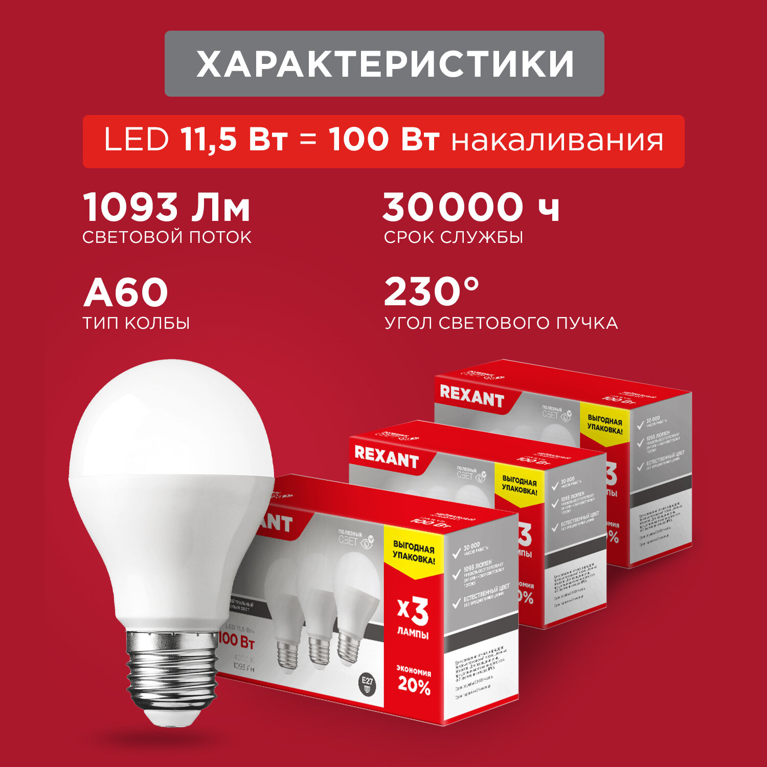 Лампочки Светодиодная лампа Rexant Груша E27, 11.5 Вт, A60, 1093 Лм (=100 Вт), 4000 K (нейтральный свет), упаковка 3 шт.