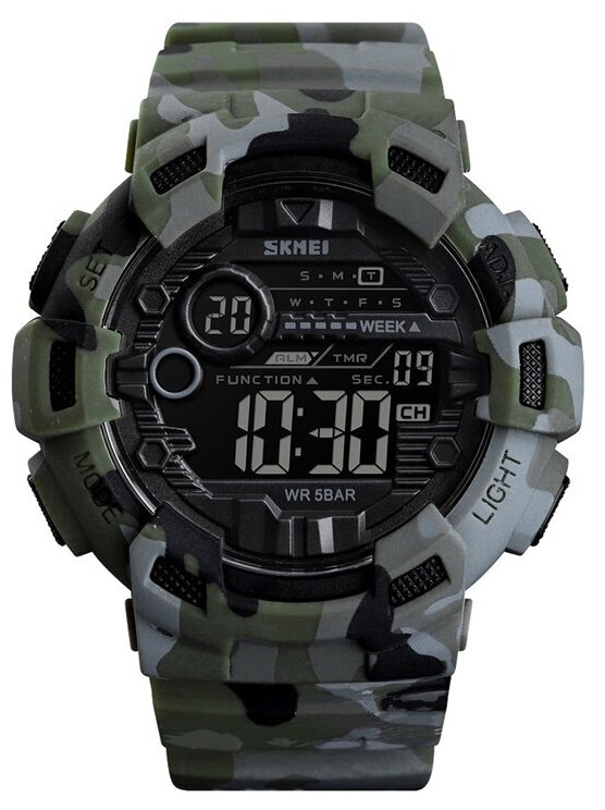 Лучшие цены. Острые и массивные грани часов SKMEI 1472 созданы для настоящих мужчин. Усиленный корпус, надежные материалы выдержат даже самые сложные испытания. Поход, путешествие, тренировка или простая прогулка - в любой ситуации часы SKMEI 1472 будут прекрасным спутником. Особенности часов SKMEI 1472 - Зеленый камуфляж Надежный механизм Цифровой механизм часов гарантирует точность хода в течение всего периода эксплуатации, а японская батарейка обеспечит долгую работу без замены. Магазины в вашем городе.