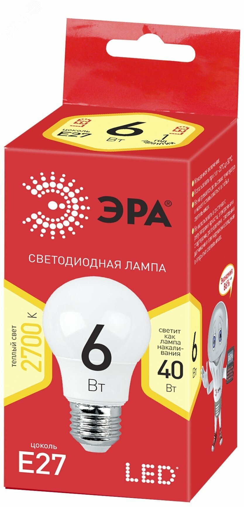 Лучшие цены. Светодиодная лампа ЭРА ECO LED A55-6W-827-E27, груша, теплый Б0028008 обладает теплым свечением, комфортным для глаз (температура наиболее приближена к утреннему солнцу и полуденному солнцу). Корпус лампы выполнен в форме груши, которая является наиболее привычной и популярной на сегодняшний день. Мягкое и равномерное распределение светового спектра не содержит вредных UV-излучений - утомляемость глаз значительно снижается, а цвета приобретают естественный оттенок и глубину. Магазины в вашем городе.