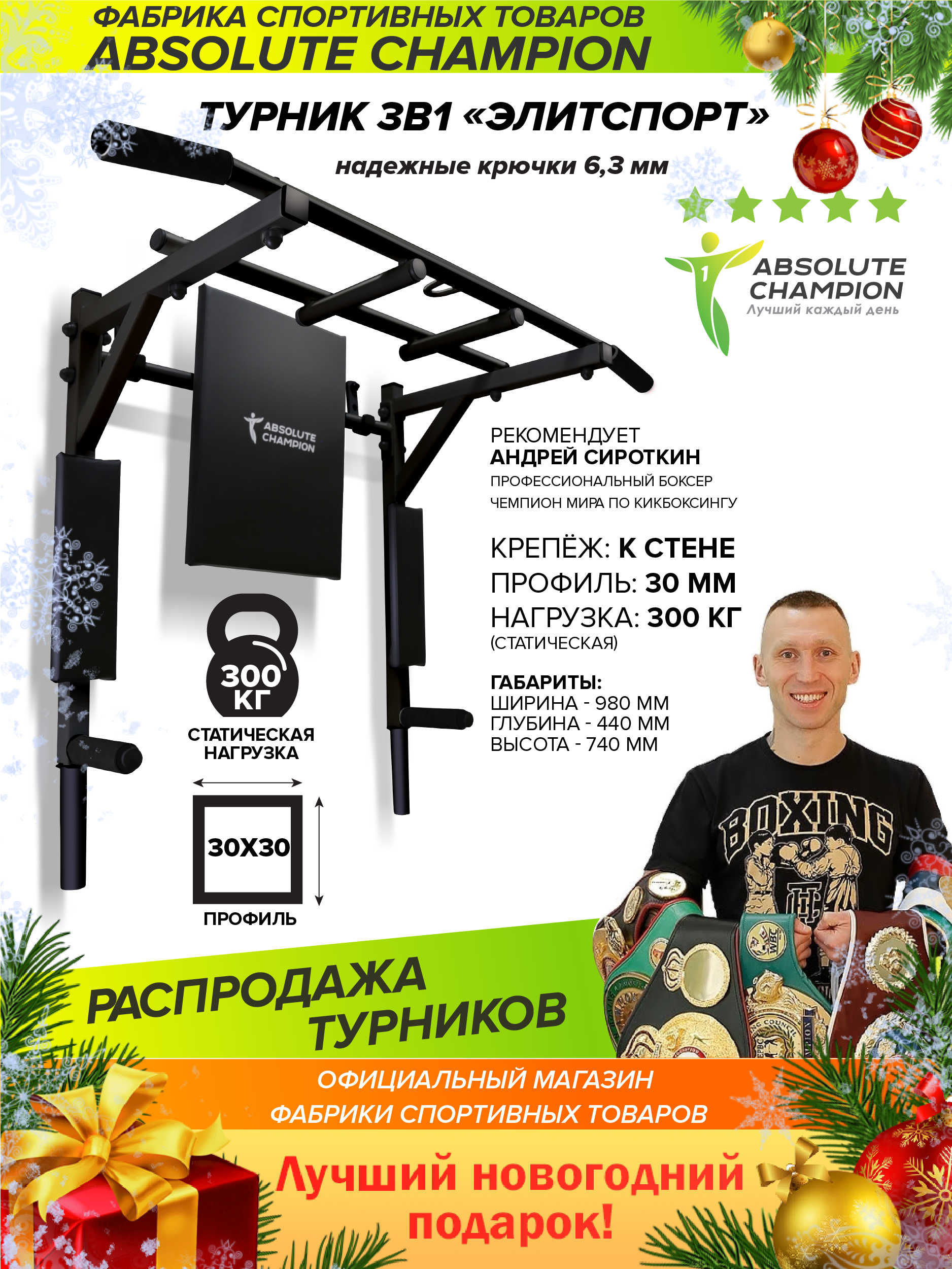Лучшие цены. Турник 3в1 ЭлитСпорт для занятий фитнесом и спортом был разработан действующим чемпионом Мира профессиональным боксёром Андреем Сироткиным и изготовлен фабрикой спорттоваров Absolute Champion. Настенный фитнес тренажер для домашних тренировок (кроссфит) крайне эффективен для развития разных групп мышц и занятий спортом. Специально для удобства ваших тренировок мы создали самый эргономичный турник брусья 3в1 в Мире! Спортивный тренажер производится из надёжного профиля 30*30. Магазины в вашем городе.