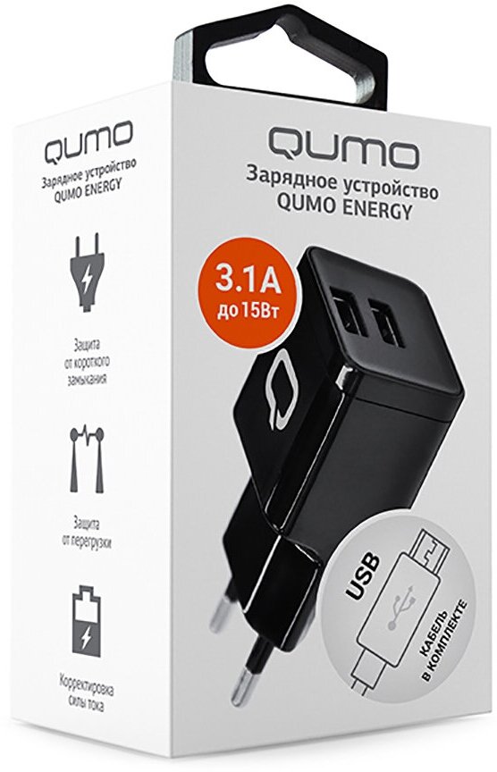 Зарядное устройство Сетевое зарядное устройство Qumo Energy, до 15Вт, 2xUSB, 5В до 2А, кабель Micro USB, Черный Charger 0061M
