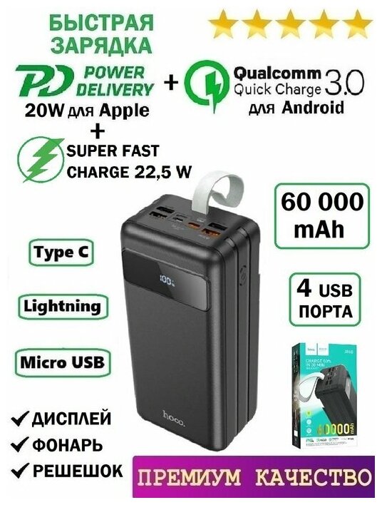 Лучшие цены. Power Bank Hoco J86B 60000 mAh в корпус встроена яркая LED лампа мягкого рассеянного света (нажмите и удерживайте кнопку питания в течение 3 секунд, чтобы включить, нажмите 2 раза, чтобы её выключить). В устройство установлена чрезвычайно мощная батарея, емкостью 60000 mAh. Этот полимерный аккумулятор относится к классу А+ и является высокоэффективным, его мощность составляет 222Wh. Магазины в вашем городе.