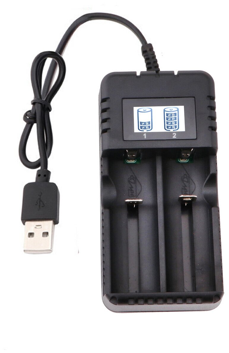 Лучшие цены. Универсальное зарядное устройство с ЖК дисплеем и индикатором зарядки. Вы можете заряжать такие типы аккумуляторов как ААА, АА, 18650 26650 и другие. Зарядное устройство имеет 2 слота для аккумуляторов. Зарядник для литийно-ионных аккумуляторов. Питание от USB блока, можно питаться от адаптера для телефона или от компьютера или ноутбука. Поставляется в желто-черной упаковке из картона. Магазины в вашем городе.