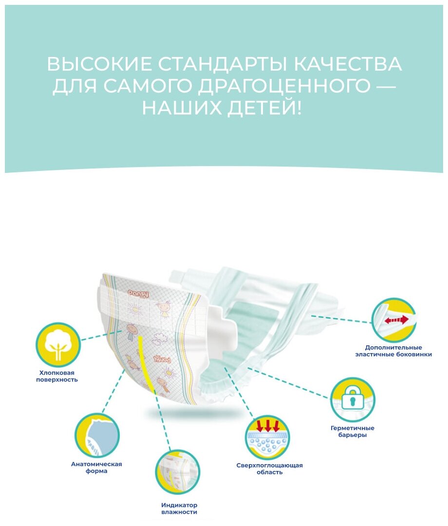 Лучшие цены. Подгузники для новорожденных 5 размер Pansy Baby это, в первую очередь, супер впитываемость. Сделаны по современной технологии из специальных полимеров, которые моментально запечатывают жидкость в подгузнике. Герметичные края создают барьер, который надёжно защитит от подтекания. Дома в кроватке, на прогулке в коляске, днём и ночью вы можете быть спокойны кожа малыша останется сухой и чистой! В детских одноразовых подгузниках Pansy Baby мальчикам, девочкам невероятно комфортно. Магазины в вашем городе.
