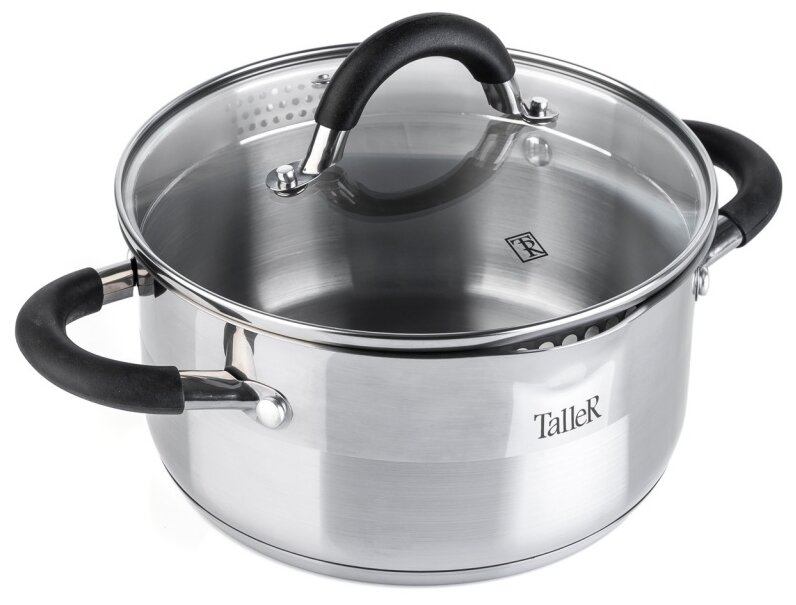 Лучшие цены. Кастрюля с крышкой "Телфорд", 20х10 смОбъем: 3,1лТолщина стенки: 0,6 ммТолщина дна: 2,8мм.Полировка внешняя - комбинированная, внутренняя - матовая.Крышка из жаропрочного стекла с отверстием для выхода пара и широким металлическим ободком с отверстиями для слива жидкости.Форма края кастрюли предусматривает желобок для удобного слива жидкости..Ручки из нержавеющей стали с силиконовыми вставками на клепках.Есть отметки литража.Нельзя использовать в духовом шкафуПодходит для всех типов плит (включая. Магазины в вашем городе.