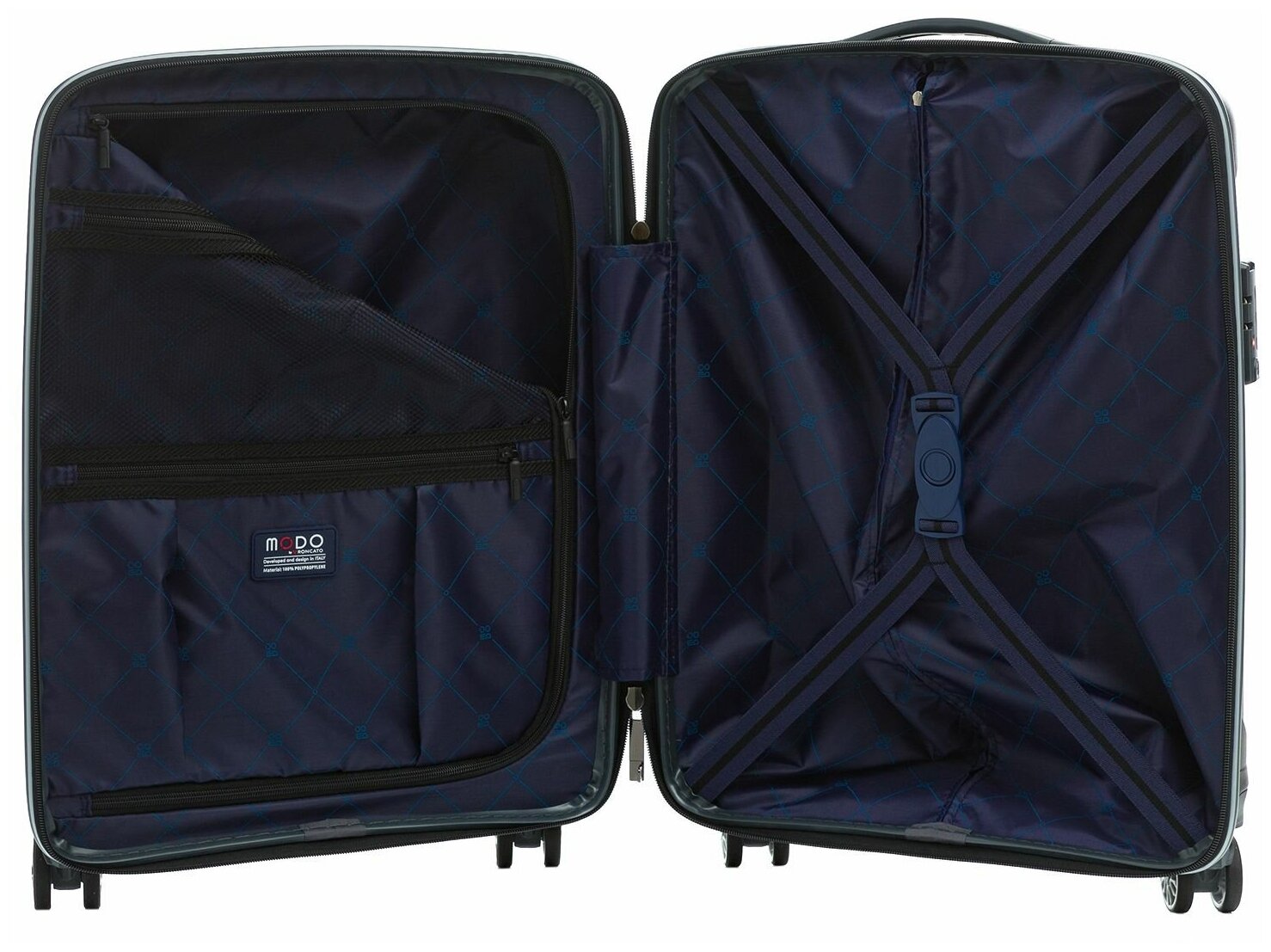 Лучшие цены. Чемодан на колесах Roncato 3403 MODO Starlight 2.0 55/20 выполнен из ультралегкого полипропилена. Этот современный материал отличается особой прочностью и длительным сроком службы. Модель имеет два внутренних отделения с перегородкой на молнии, а также два кармана на молнии и перекрестные ремни с зажимом для одежды. Выдвижная ручка имеет фиксатор в двух положениях. Магазины в вашем городе.