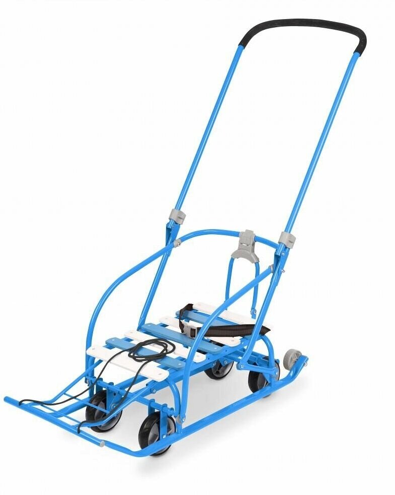 Санки Nikki 3 голубой со складной спинкой и складной ручкой на 4 колесах