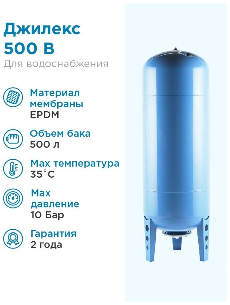 Лучшие цены. Гидроаккумулятор Джилекс 500В (вертикальная компоновка с металлическим фланцем) имеет объем 500 литров со специальными ножками у основания и рекомендуется для автоматизированных систем водоснабжения с погружными и поверхностными насосами. Зачастую используется для 5 точек водоразбора. Магазины в вашем городе.