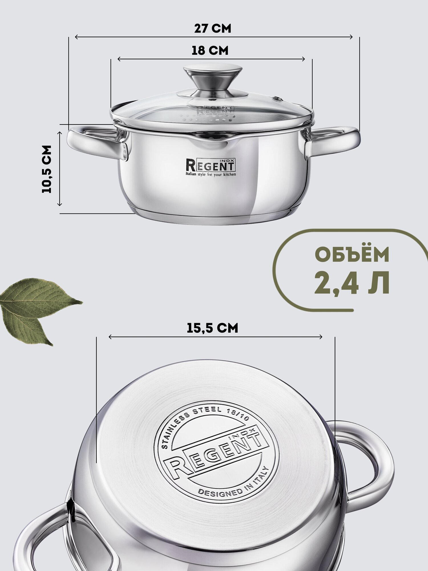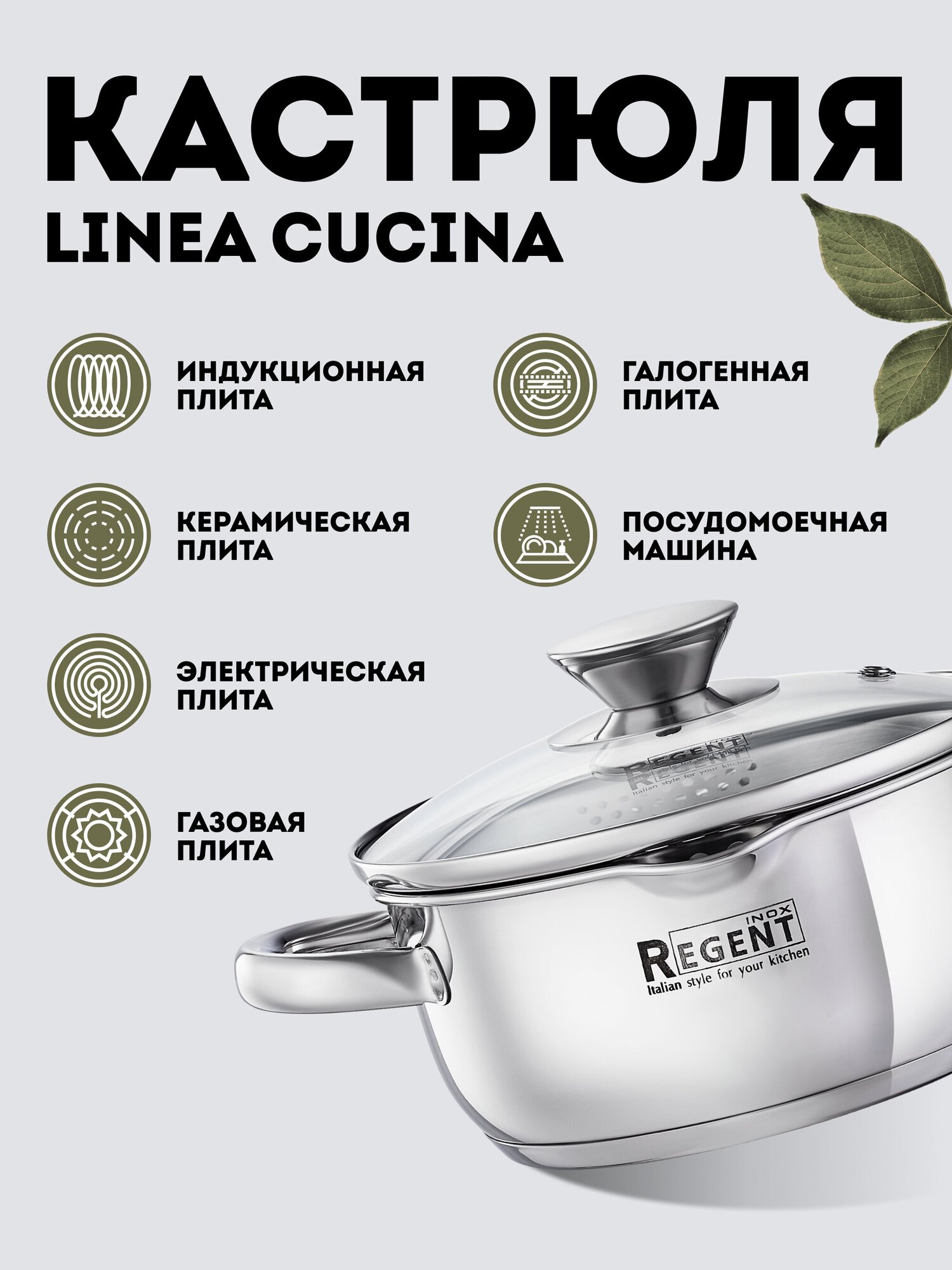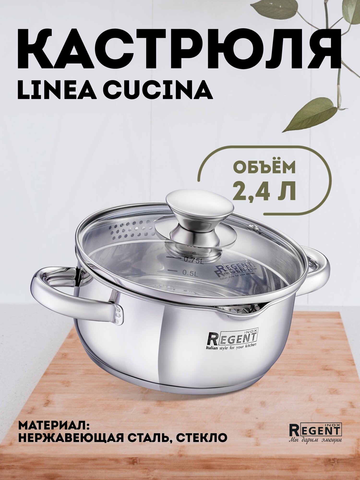 Лучшие цены. Кастрюля 2,4л нержавеющая сталь 18/10 толщина дна-3,0мм; толщина стенок-0,60мм, зеркальное полирование, ручки металические (точечная сварка), крышка из боросиликатного стекла использование: индукционные, электрические, газовые, керамические, галогеновые плиты и посудомоечная машина упаковка: цветной картон 18х9,5см, Linea CUCINA Технические характеристики: 26х18х9,5см; 1,163кг; 2,4л; Нержавеющая сталь, стеклянная крышка, металлические ручки (точечная сварка). Магазины в вашем городе.