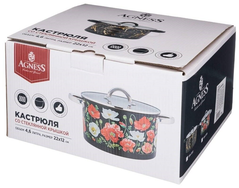 Лучшие цены. Кастрюля маки со стеклянной крышкой, нерж. сталь, 4,6л 22х12 см Agness (916-308) Изделие имеет уникальное эксклюзивное покрытие - комбинирование матового фона и глянцевого рисунка, которое не имеет аналогов на рынке. Коллекционный дизайн "Маки" делает эту модель привлекательной для подарка себе и своим близким. Еще одна особенность этой модели: утолщенные стенки корпуса - 0,6 мм. Такая толщина стенок обеспечивает равномерность распределения тепла и его сохранение на более длительное время. Магазины в вашем городе.