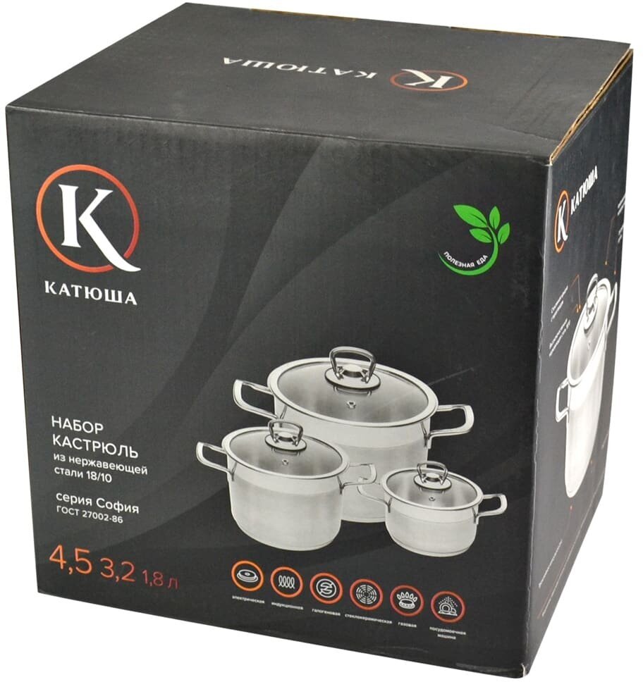 Кастрюли Набор нерж. сталь, 6 предметов (3 кастрюли 1.8/3.2/4.5 л. + 3 крышки), София, стеклянная крышка, катюша, арт. 9901-902-0