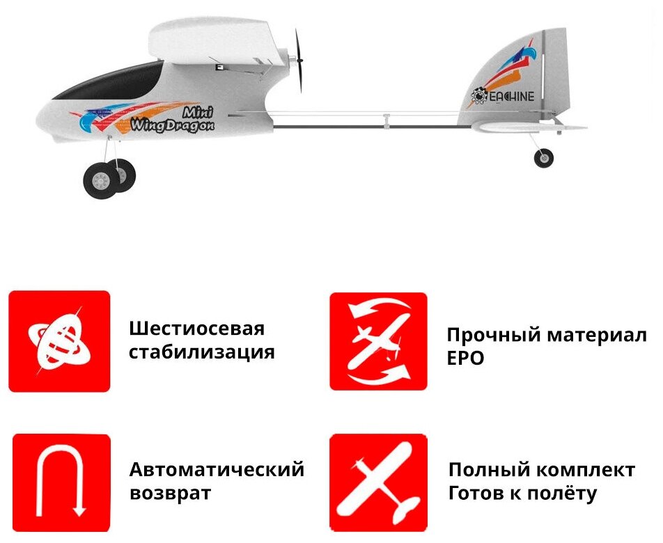 Лучшие цены. Eachine Mini Wing Dragon с размахом крыла 540 миллиметров – самый простой из полностью готовых к полёту самолётов для начинающих в линейке производителя. Благодаря полётному весу менее 250 граммов, не потребуется регистрация модели или её постановка на учёт. Установлен улучшенный полётный контроллер с 6-осевым гироскопом, который имеет три режима: для начинающих, продвинутых и опытных пилотов. Вы сможете даже при отсутствии опытного наставника пройти путь от нулевого уровня подготовки до второй модели. Магазины в вашем городе.