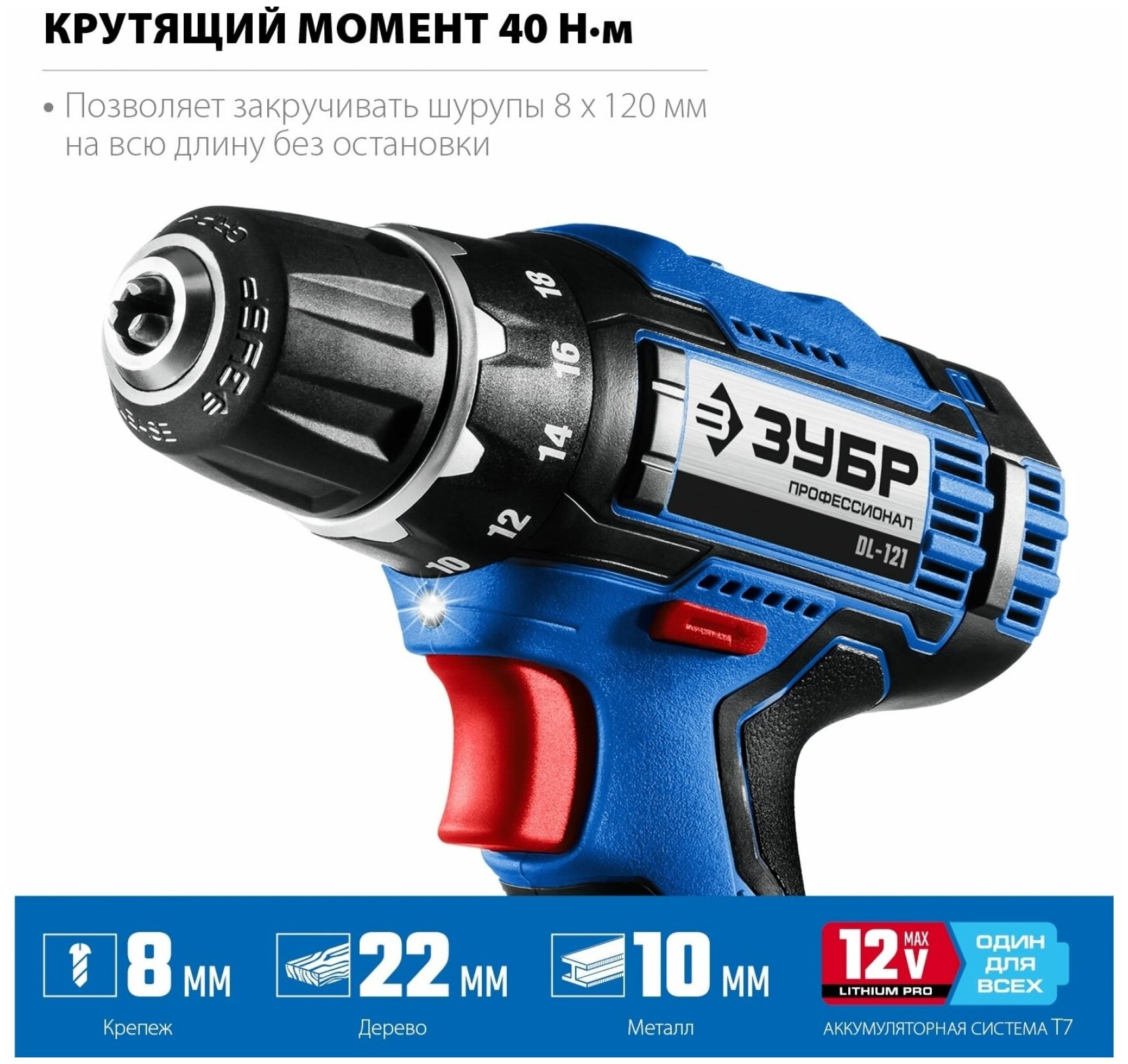 ЗУБР Т7, 12 В, 40 Н·м, без АКБ, дрель-шуруповерт, Профессионал (DL-121)