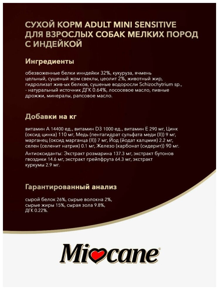 Корм для собак Miocane Adult Mini Sensitive сухой корм для взрослых собак мелких пород с индейкой - 1,5 кг