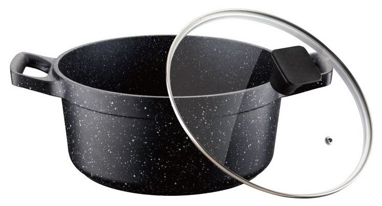 Лучшие цены. РН-15872-24 Кастрюля Изготовлена из литого алюминия черного цвета с белыми вкраплениями Под гранит Дно обеспечивает равномерное нагревание Стеклянная крышка с бакелитовой ручкой Пригодна для мытья в посудомоечной машине. Диаметр - 24 см, размер 24см х11,5см Ёмкость 4,5 л. Магазины в вашем городе.