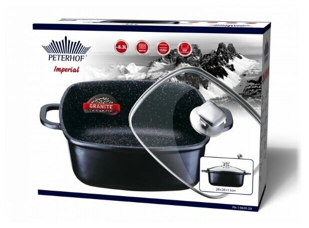 Лучшие цены. РН-15830-28 Кастрюля Состоит из 2-х предметов Изготовлена из литого алюминия с черным внешним покрытием Внутреннее гранитное покрытие Дно обеспечивает равномерное нагревание Стеклянная крышка с метал. ручкой Подходит для всех видов плит, включая индукционные, а так же для духовых печей. Пригодна для мытья в посудомоечной машине. Форма квадратная Размер 28х28х11 см Ёмкость ~6,3л. Магазины в вашем городе.