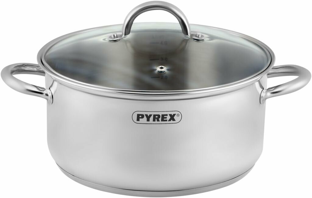 Лучшие цены. Кастрюля PYREX Master выполнена из высококачественной нержавеющей стали и имеет объем 4.8л. Гладкое покрытие не окрашивается и устойчиво к впитыванию посторонних запахов. Кастрюля оснащена двумя удобными клепанными ручками. На внутреннюю поверхность посуды нанесена мерная шкала литража. Подходит для всех типов плит. В комплекте поставляется стеклянная крышка. Магазины в вашем городе.