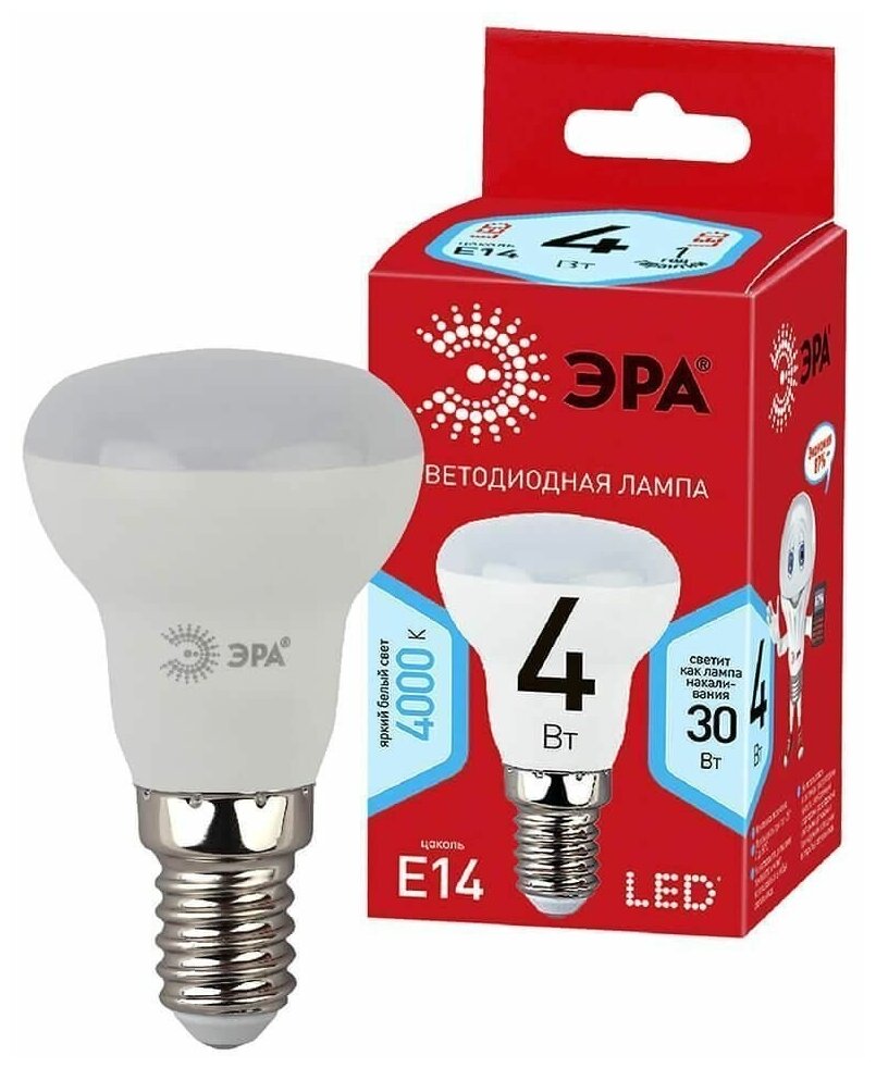 Лучшие цены. Лампочка светодиодная ЭРА RED LINE ECO LED R39-4W-840-E14, рефлектор, белый свет - упаковка 10шт. Цоколь - Е14. Мощность - 4Вт. Цветовая температура, K - 4000. Световой поток, lm - 320. Магазины в вашем городе.
