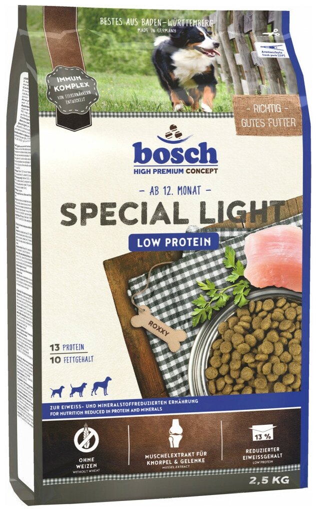 Лучшие цены. Bosch Special Light - полнорационный корм с пониженным содержанием белка и минеральных веществ Корм с пониженным содержание белка и минеральных веществ предназначен для собак с чувствительной мочевыделительной системой, а также питомцев, имеющих проблемы, связанные с нарушением работы печени и почек. Корм Bosch Special Light с пониженным содержанием белка (13%) помогает быстро восстановиться после заболеваний, сопровождающихся нагрузкой на почки и печень. Магазины в вашем городе.