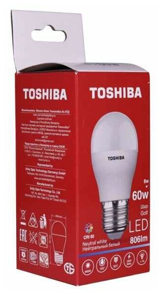 Лучшие цены. Лампа светодиодная предназначена для освещения различных помещений. Аналог лампы накаливания - 60 вт. Корректно работает с выключателями с индикаторами подсветки. Обеспечивает стабильный световой поток на протяжении всего срока службы. Другие преимущества светодиодных лампочек TOSHIBA: Светодиодные лампы TOSHIBA являются энергосберегающим источником света. Лампочки TOSHIBA безопасны для здоровья так взрослого человека, как и ребенка. Магазины в вашем городе.