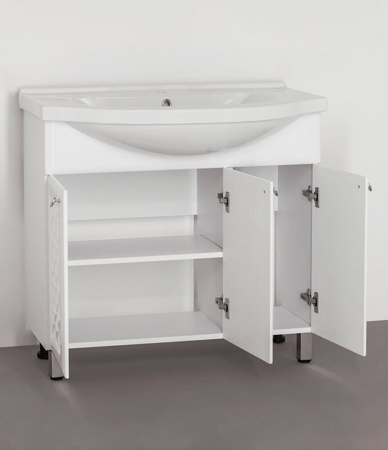 Лучшие цены. Габариты (Ш Г В): 86.8 х 34 х 80 см Напольная С механизмом доводчика, обеспечивающим плавное закрывание Белая Материал корпуса: ЛДСП Покрытие корпуса: ламинат Материал фасада: МДФ Покрытие фасада: пленка Фурнитура: хром Дверки Гарантия: 1 год Россия Умывальник Эльбрус 90. Магазины в вашем городе.
