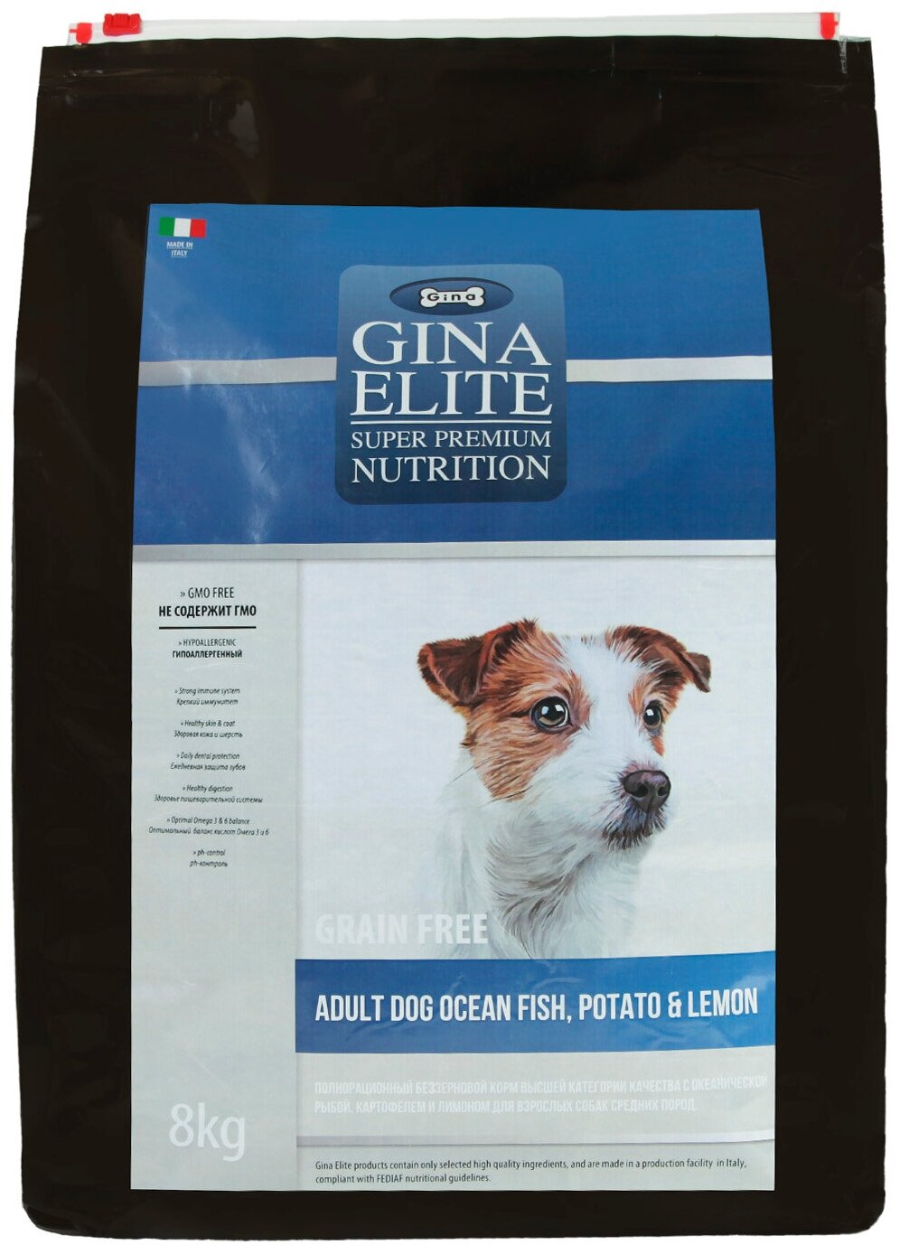 Gina Корм сухой беззерновой Elite Dog Dog Ocean Fish, Potato&Lemon 8 кг, с океанической рыбой, картофелем и лимоном для взрослых собак средних пород (Италия)