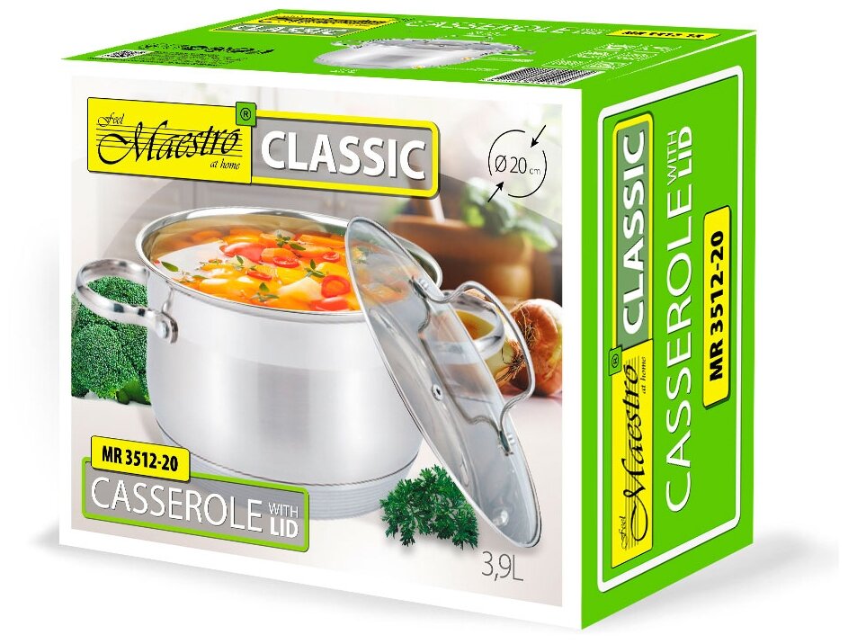 Лучшие цены. Кастрюля Maestro MR 3512-20 объёмом 3,9 литра, изготовлена из высококачественной нержавеющей стали. Толстое термоаккумулирующее дно подходит для любых источников тепла включая индукцию. Стеклянная крышка диаметром 20 см с отверстием для выхода пара и защитным стальным ободком по периметру. Размер: 20х12,5 см; девятислойное термоаккумулирующее дно: 0,5 мм алюминий, 2 мм железо, 0,5 мм алюминий; внутри изделия – зеркальная полировка, внешняя полировка - сатин с зеркальной полосой вверху. Магазины в вашем городе.