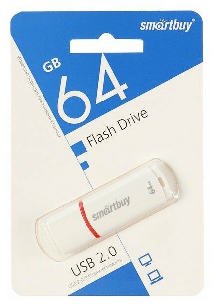 USB-флешки Флешка Smartbuy Crown White, 64 Гб, USB2.0, чт до 25 Мб/с, зап до 15 Мб/с, белая