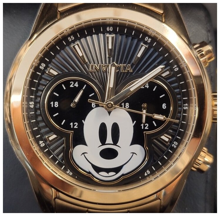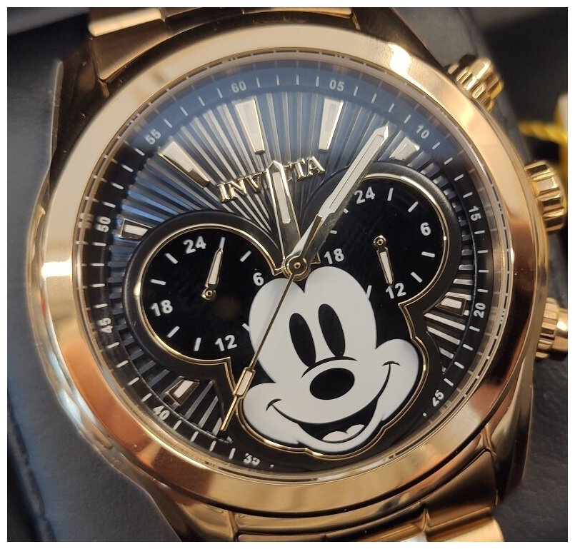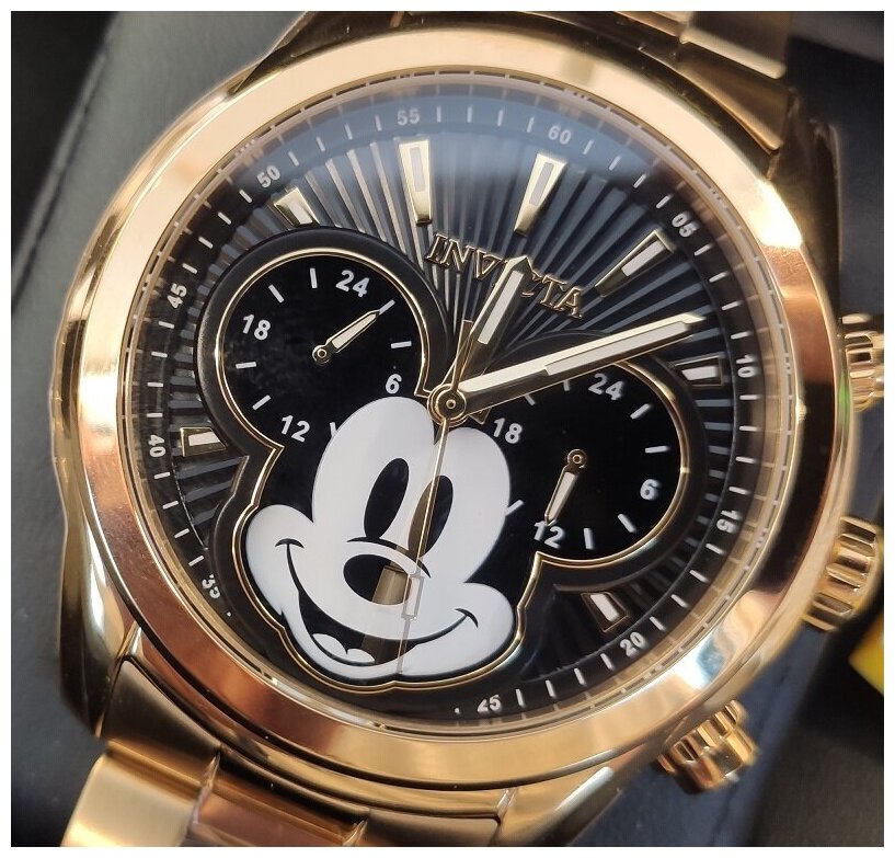 Лучшие цены. Пол: Мужские Механизм: Японский кварцевый Seiko VD32 Корпус: Хирургическая сталь 316L / позолоченный (23К) Циферблат: Черный , металлический , с Микки Маусом / акценты золотистые , белые Браслет: Стальной , позолоченный Стекло: Антибликовое Flame Fusion Crystal Безель: Стационарный Функции: Дайвер. Хронограф. 24-ех часовой циферблат. Центральная секундная стрелка. Люминесцентные стрелки и метки Tritnite. Магазины в вашем городе.