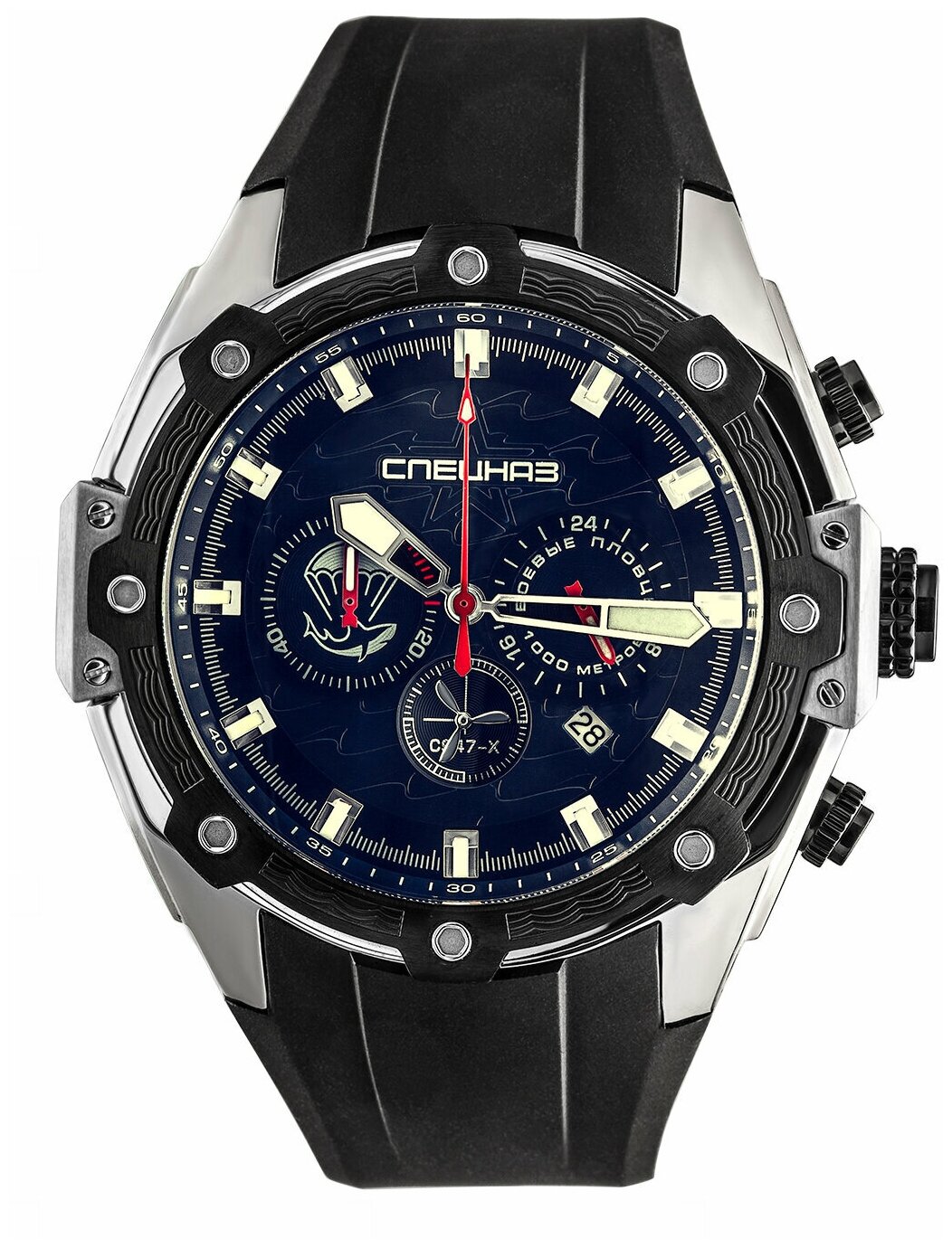 Лучшие цены. Мужские часы. Коллекция Боевые пловцы. Надежный российский аксессуар для мужчин, для которых не существует преград. Тип механизма: кварцевый. Калибр: Miyota OS20. Корпус: сталь с частичным PVD покрытием. Циферблат: синий. Браслет: полиуретановый. Водозащита: 1000WR. Подсветка: люминесцентные стрелки и метки. Стекло: минеральное с сапфировым покрытием. Календарь: число. Габаритные размеры: D 45мм, толщина 15мм. Магазины в вашем городе.