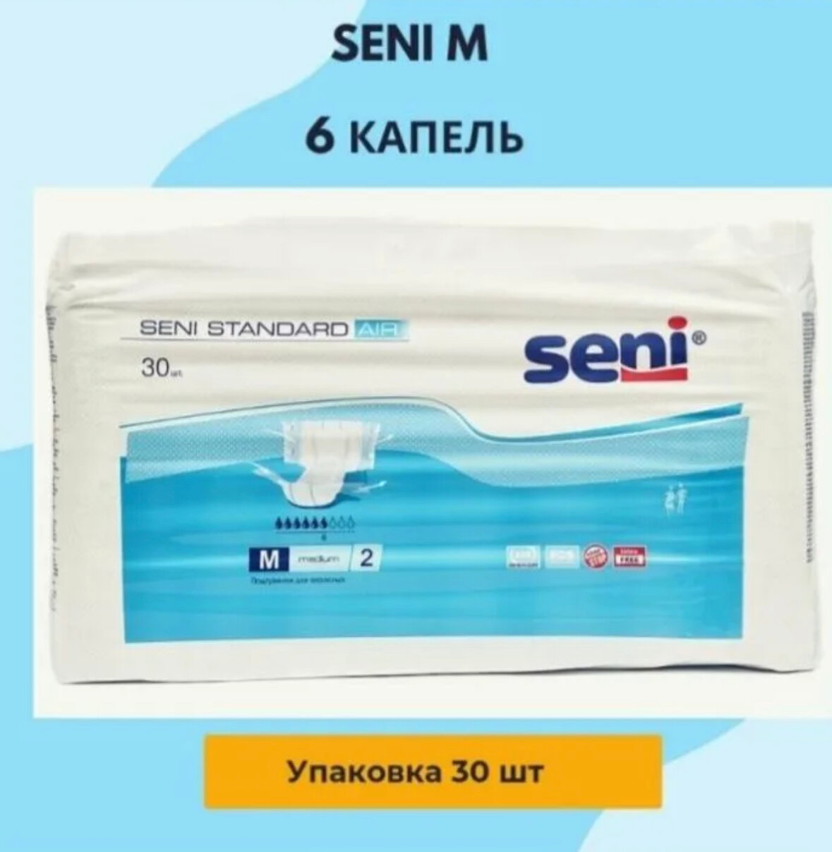 Лучшие цены. Подгузники Seni standard Air Medium(M) (75-110см) - это классические памперсы для взрослых, обеспечивают хорошую и проверенную защиту при средней и тяжелой формах недержания. Предназначены как для активных людей, так и для людей с ограниченными двигательными возможностями. Обхват талии: М - 75-11- см Впитываемость: 6 капель Гипоаллергенный материал Эластичный пояс Свойства: дышащие «дышащий» (паропроницаемый). Магазины в вашем городе.