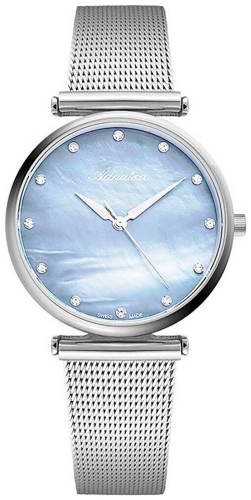 Лучшие цены. Швейцарские женские часы. Коллекция Milano. Очаровательные часики с перламутровым циферблатом не оставят равнодушной ни одну женщину. Тип механизма: кварцевый. Калибр: ETA F04. Корпус: сталь. Циферблат: перламутровый голубой. Браслет: стальной миланский . Камень-вставка: циферблат украшен 12 фианитами. Водозащита: 30WR. Стекло: минеральное. Габаритные размеры: D 35мм, толщина 7мм. Магазины в вашем городе.