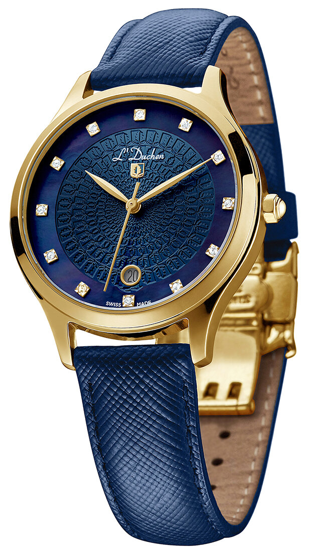 Лучшие цены. Часы наручные L'Duchen D 791.23.37. Циферблат часов серии Grace притягивает взгляд затейливым рисунком из стилизованных дубовых листьев — логотипом бренда L'Duchen — в центральной его части и вставкой из натурального перламутра, дополненной блеском фианитов. Стальной корпус с полированным безелем превосходно сочетается с ремешком из натуральной кожи, цвет которого перекликается с оттенком циферблата. Бесперебойную работу часов обеспечивает кварцевый швейцарский механизм. Магазины в вашем городе.